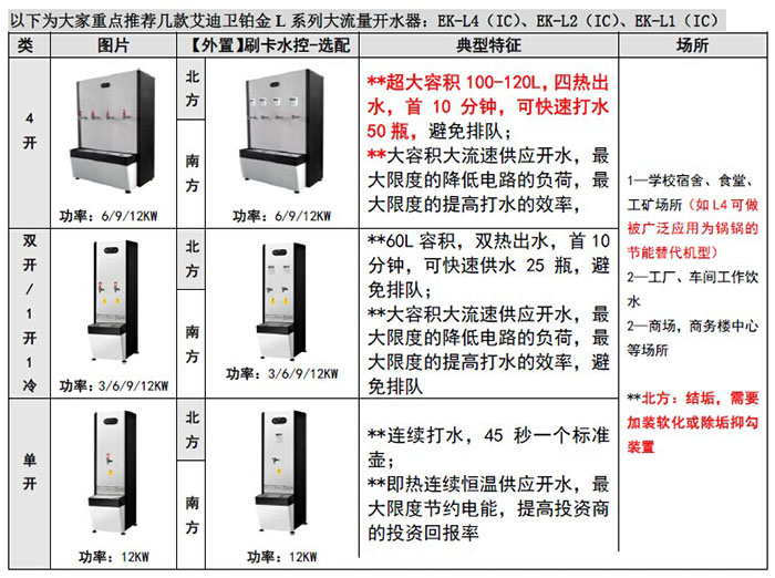 ----》iDIY步進(jìn)式:節(jié)能EK-L2和EK-L4系列,大容積大流速供應(yīng)開水,最大限度的降低電路的負(fù)荷,最大限度的提高打水的效率,避免排隊;經(jīng)典產(chǎn)品:EK-B60IC 和 EK-B120L4IC(可附上重點產(chǎn)品特征)