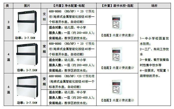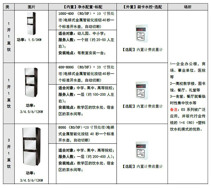 ----》典型機型:ER-42、ET-43、EW-44、EW-46,可滿足中小學(xué)課間操集中供應(yīng)大流量的溫度適宜的直飲水,符合政府校園直飲水項目的各技術(shù)指標(biāo)